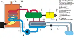 Der zum Betrieb der Dampfturbine notwendige Wasserdampf wird in einem Dampfkessel aus zuvor gereinigtem und aufbereitetem Wasser erzeugt. Durch weiteres Erwärmen des Dampfes im Überhitzer nimmt die Temperatur und das spezifische Volumen des Dampfes zu. Vom Dampfkessel aus strömt der Dampf über Rohrleitungen in die Dampfturbine, wo er einen Teil seiner zuvor aufgenommenen Energie als Bewegungsenergie an die Turbine abgibt. An die Turbine ist ein Generator angekoppelt, der die mechanische Leistung in elektrische Leistung umwandelt. Danach strömt der entspannte und abgekühlte Dampf in den Kondensator, wo er durch Wärmeübertragung an die Umgebung kondensiert und sich als flüssiges Wasser an der tiefsten Stelle des Kondensators sammelt. Über die Kondensatpumpe und den Vorwärmer hindurch wird das Wasser in einen Speisewasserbehälter zwischengespeichert und dann über die Speisepumpe erneut dem Dampfkessel zugeführt.