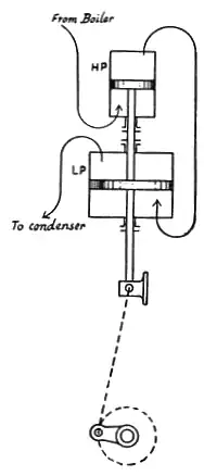 - ↑ Beide Zylinder sind jeweils am oberen Totpunkt bzw. umgekehrt. Bei den zweizylindrigen Zwillingsdampfmaschinen sind die Kolben jeweils um 90° entgegengesetzt in Betrieb.
