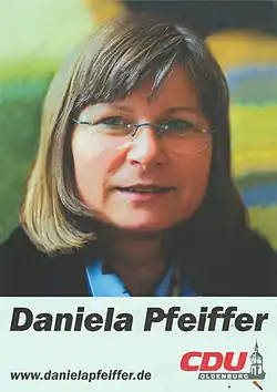 Daniela Pfeiffer (* 22. August 1957 in Reutlingen) ist eine deutsche Politikerin, zuerst in der CDU, seit 2011 in der FDP.[1] Sie ist verheiratet und hat zwei Kinder.