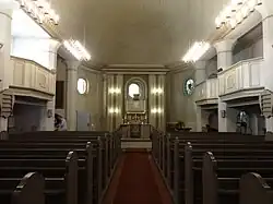 Im neuklassizistisch-neobarock gestalteten Innenraum mit 450 Sitzplätzen dominieren ein hölzernes Tonnengewölbe sowie eine mit Kassetten verzierte Hufeisenempore. An den beiden hinteren Pfeilern der Orgelempore sind Reste der ursprünglichen Ausmalung erhalten geblieben. Sie zeigen Szenen aus dem Garten Eden sowie Figuren aus der Reformation.