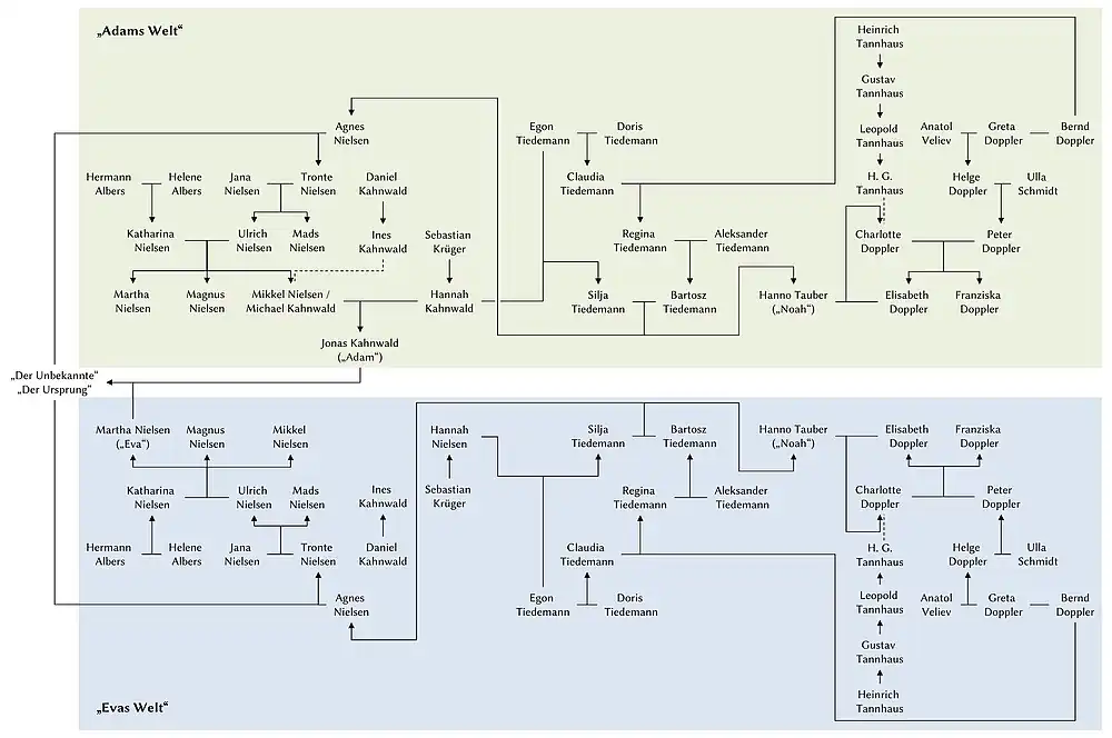 Der erwachsene Jonas ist unbeabsichtigt mit Magnus, Franziska und Bartosz ins Jahr 1888 gereist. Dort versuchen sie jahrelang, mit einer Maschine das Wurmloch zu erzeugen. Während dieser Zeit reist Hannah, die zuvor ins Jahr 1954 gereist ist und dort eine Affäre mit Egon begonnen hatte, mit ihrer Tochter Silja zu den vier Zeitreisenden, wo sie von Jonas, der allmählich zu Adam wird, getötet wird. Silja wird später von Adam ins Jahr 2052 geschickt, um dort Jonas zu empfangen und später wieder zurückzureisen. Sie wird die Frau von Bartosz und gemeinsam bekommen sie die Kinder Agnes und Hanno, der später zu Noah wird. Elisabeth erklärt im Jahr 2053 ihrer Mutter Charlotte, wer ihre Eltern sind: Es sind Noah und sie selbst, Elisabeth. Claudia beschließt unterdessen, ihr eigenes Ich aus Evas Welt zu töten, um als Spionin zwischen den Welten zu agieren und den Lauf der Dinge zu beeinflussen. Sie ist fest dazu entschlossen, ihre an Krebs erkrankte Tochter Regina zu retten, indem sie die endlose Zeitschleife vernichtet. Sowohl Adam als auch Eva scheitern jedoch bei dem Versuch, gegen den anderen zu gewinnen. Nachdem Adam vergebens die schwangere Martha aus Evas Welt getötet hat, muss er feststellen, dass durch das Auslöschen des vermeintlichen Ursprungs die Zeitschleife nicht aufgelöst wird. Claudia erklärt ihm, dass es durch Quantenverschränkung dazu gekommen ist, dass es eine weitere Martha und einen weiteren Jonas gibt. Im Zeitpunkt der Apokalypse stand die Zeit für einen Moment still, weshalb es möglich war, dass Jonas sowohl von Martha gerettet wird, als auch sich selbst in Sicherheit bringen musste, während Martha ihn sowohl gerettet hat, als auch mit Bartosz in Evas Welt zurückgereist ist. Dadurch ist es möglich, den wahren Ursprung der Zeitschleife zu zerstören. Dieser liegt in einer anderen, einer dritten Welt (Triqueta). In dieser „Ursprungswelt“ verliert H. G. Tannhaus seinen Sohn Marek, dessen Frau Sonja und ihr gemeinsames Kind bei einem Verkehrsunfall. Um dieses Ereignis rückgängig zu machen, baut er eine Zeitmaschine, mit der er im Jahr 1986 die Spaltung seiner Welt in Adams und Evas Welt verursacht und damit die endlose Zeitschleife auslöst. Jonas und Martha gelingt es, in diese Ursprungswelt zu reisen und Marek und Sonja davon zu überzeugen, zu H. G. Tannhaus zurückzukehren. Sie sterben nicht, wodurch sich Jonas und Martha sowie Adams und Evas Welt vollständig auflösen. Ohne es zu wissen, hat H. G. Tannhaus mit dem Bau der Zeitmaschine somit tatsächlich die Vergangenheit geändert.