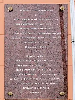 | Darmstadt Haus In Erinnerung an E. T. A. Hoffmann restauriert in Jahren 1995–1996 Dieser Bau wurde von der Stiftung für deutsch-polnische Zusammenarbeit aus Mitteln der Bundesrepublik Deutschland mit Beteiligung der Partnerstädte Darmstadt und Płock gefördert |