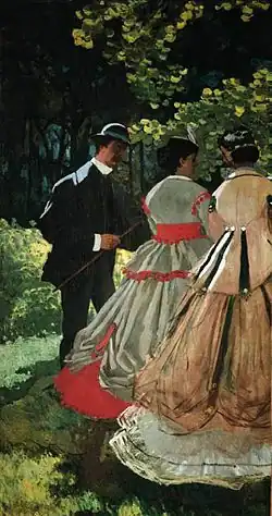 Das Bild plante Monet in Anlehnung an Manets Gemälde Das Frühstück im Grünen aus dem Jahr 1863, das mit der ohne mythologischen Zusammenhang dargestellten Nacktheit einen Skandal hervorrief. Monet bewunderte die Werke Manets, zu dem er seit 1866 einen engeren Kontakt hatte. Monet wollte jedoch sein Gemälde eher dem Massengeschmack entsprechend gestalten.