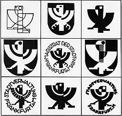 Neben der Architektur und dem Produktdesign wurde auch dem Grafikdesign eine bedeutende Rolle zugemessen. In den 1920er Jahren empfahl der Deutsche Städtetag eine bürotechnische Harmonisierung innerhalb von Verwaltungen, die auch die Grafik umfassen sollte.[27] Frankfurt begann 1925 als erste Stadt mit der Umsetzung, es folgten Berlin 1927 und Hannover 1929. Als Hausfarben wurden Rot und Weiß festgelegt, als Kontrastfarbe Schwarz. Hans Leistikow entwarf neben den amtlichen Unterlagen auch ein neues Stadtwappen.