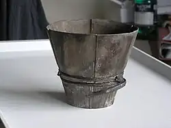 Ihre Herstellung ähnelt dem Böttchern eines Holzeimers, bei der aus mehreren aneinander angepassten, rechteckig bis trapezförmig ausgeführten dünnen Holzplättchen und einem runden Boden mittels Ruten oder Bänder ein Holzgefäß hergestellt wird. Dieses dichtet sich bei einer ausreichend häufigen Benutzung oder Wässerung durch das Aufquellen des Holzes selbst ab.