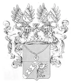 Das reichsfreiherrliche Wappen zeigt in Silber drei sechsstrahlige blaue Sterne; den mit einer reichsfreiherrlichen Krone bedeckten Schild umgibt eine goldene Gnadenkette, an der ein Medaillon mit dem Bildnisse Karl VI. hängt. Schildhalter: zwei goldene Löwen.[3]