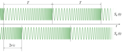 Auch mit unmoduliertem Dauerstrichradar ist mit gewissen Einschränkungen eine Entfernungsmessung möglich. Dazu müssen zwei gleiche unmodulierte Dauerstrichradarmodule, mit geringfügig unterschiedlichen Sendefrequenzen f1 und f2, unabhängig voneinander parallel betrieben werden, deren Ausgangssignale einer gemeinsamen Signalverarbeitung unterliegen.[28] Bei der Ausbreitung der elektromagnetischen Wellen entsteht eine Schwebung beider Schwingungen. Die Zielentfernung kann mittels der Phasendifferenz ΔΦ zwischen beiden Echosignalen bestimmt werden, wobei die Möglichkeiten der Geschwindigkeitsmessung in beiden Kanälen erhalten bleiben. Es werden also beide Ausgangssignale der Dauerstrichradarmodule auf die Eingänge einer Phasenmessschaltung gegeben. Die Phasendifferenz ist proportional zu der Frequenzdifferenz der Sender und der Entfernung R(t) zum Ziel: