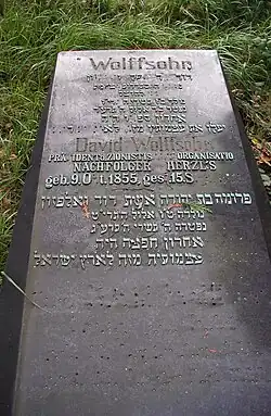 Wolffsohn hatte sodann die Absicht, nach Eretz Israel auszuwandern, kaufte sich auch wenige Monate nach dem Kongress ein großes Grundstück in der Nähe von Jaffa, konnte sich jedoch diesen Wunsch nicht mehr erfüllen: Auf der Rückreise von einem Kuraufenthalt in der Schweiz verstarb der herzkranke Wolffsohn am 15. September 1914 in Bad Homburg vor der Höhe und wurde am 18. September 1914 auf dem Jüdischen Friedhof in Köln-Deutz neben seiner 1912 verstorbenen Frau Fanny bestattet.[1] 1952 wurden seine sterblichen Überreste mit denen seiner Frau nach Jerusalem überführt und neben denen Theodor Herzls, auf dem Herzlberg, beigesetzt.