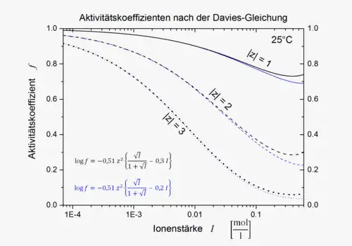 Die Daviesgleichung gibt den Zusammenhang zwischen der Ionenstärke I einer Lösung und dem Mittelwert der ionischen Aktivitätskoeffizienten f (bzw. dessen dekadischem Logarithmus). Bei Temperaturen um 25 °C lautet die Gleichung: