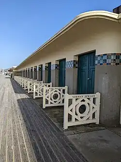 Die weltberühmte hölzerne Promenade entlang des Strandes von Deauville mit seinen bunten Sonnenschirmen, die auch eines der absoluten Markenzeichen Deauvilles darstellen (deren dominierende Farben blau und rot sind gleichzeitig die Farben der Stadt), wurde 1923 aus so genanntem Ekki- und Ebaholz, exotischen und unverrottbaren Holzarten aus Madagaskar, auf einer Länge von 643 Metern erbaut. Die Promenade ist auf einer Seite von kleinen Strandkabinen begrenzt, die die Namen von Hollywoodschauspielern und -regisseuren tragen, die Deauville, vor allem wegen des jährlich stattfindenden Festival des amerikanischen Films, besucht haben.