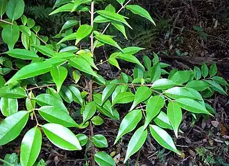 Die gegenständig an den Zweigen angeordneten Laubblätter sind in Blattstiel und Blattspreite gegliedert.[1] Die einfachen Blattspreiten sind drüsig punktiert und fiederadrig mit intramarginalen Blattadern. Die relativ kleinen und fadenförmigen Nebenblätter fallen früh ab.[2]