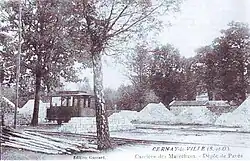 Bereits 1881 wurde dort eine Pferdebahn betrieben.[2] Ab 1885 wurden die Pflastersteine, Mühlsteine, Schotter und Sand mit einer 6,447 km langen Decauville-Feldbahn mit einer Spurweite von 600 mm zum Bahnhof Essarts-le-Roi an der Bahnstrecke Paris – Le Mans transportiert.[1] Sie folgte im Wesentlichen der gerade verlaufenden Forststraße Cinq Cents Arpents und überquerte auf einer heute noch erhaltenen Stahlbrücke (Pont Artus) die Normalspureisenbahn zu einer Umladevorrichtung auf Lastkraftwagen für den Weitertransport im Straßenverkehr. Sie war eine der ersten Feldbahnen, auf denen Decauville-Dampflokomotiven eingesetzt wurden.[3] Ab 1887 ersetzten Kipploren und tragbare Gleise die bisher in Steinbrüchen verwendeten Schubkarren.[1]