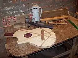 Flache Instrumentendecken bestehen meist aus einem Werkstück, das entweder aus Sperrholz, bei hochwertigen Instrumenten aber auch aus einem bis zwei Stücken massiven Holzes ausgesägt wird. Massivholzdecken wird generell eine bessere Klangformung zugeschrieben.[1] Ein weit verbreitetes Klangholz bei flachen Decken ist Fichtenholz; bei einigen Instrumenten wird auch Zedernholz verwendet. Je nach Größe der Instrumente sind flache Decken auf der Innenseite in der Regel mit aufgeleimten Holzstreben oder -leisten verstärkt (engl.: Bracing), deren Materialstärke, Zahl und Anordnung großen Einfluss auf den Klang der Instrumente hat. Eine besondere Form ist die bei Akustikgitarren mit Stahlsaiten angewendete Beleistung in Kreuzform (X-Bracing). Bei Akustikgitarren wurde diese Technik erstmals um das Jahr 1850 vom US-Gitarrenhersteller C. F. Martin angewendet.[3] Weitere Formen des Bracings sind verschieden fächerartig angeordnete und parallele Beleistungen.[4]