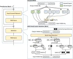 Mehrere Fortschritte bei der Implementierung wie Multi-head Latent Attention (MLA)[14] mit etwa auf 10 Prozent reduzierten Zugriffen auf die Datenspeicher erlaubten DeepSeek, das Modell V2 zu tieferen Nutzungspreisen anzubieten als die Konkurrenz. Die Kosten für einzelne Resultate (Schlussfolgerungen, Inferenzen) im Vergleich zu GPT-4 konnten auf ein Siebtel reduziert werden.[15] Im Leistungsvergleich mit anderen Chatbots schloss DeepSeek V2 gut ab.[16]