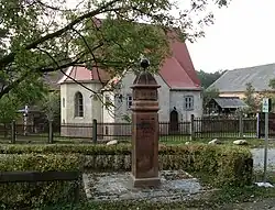 Ein Gedenkstein im Gutspark, der früher ein Reiterstandbild von Friedrich dem Großen trug,[5] erinnert an dessen Beobachtungspunkt in der Schlacht bei Roßbach.