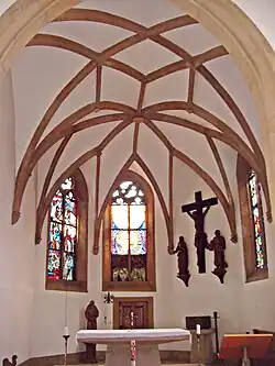 Die spätgotische Kapelle wurde äußerlich in den mehr als 500 Jahre ihres Bestehens kaum verändert.[23] Erbaut wurde sie von einer niederbayerischen Bauhütte, die wohl auch an der Errichtung der Nikolauskirche im benachbarten Gimmeldingen beteiligt war.[24] Die Spitalkapelle ist ein kleiner Saalbau, dessen Chor gegenüber dem Schiff leicht südlich versetzt ist. Die Kapelle ist außen verputzt, und die Fenster haben Fischblasenmaßwerk. Ein Relief an der Westfront des Gebäudes hin zur Weinstraße zeigt das Wappen des Stifters des Spitals, Nikolaus von Böhl. Im Innern wird der Chor von einem achtteiligen Sterngewölbe überspannt.[2] Die ursprüngliche spätmittelalterliche Ausstattung blieb nicht erhalten. Von dem 1859 erneuerten und inzwischen abgerissenen Hochaltar befindet sich in der Kirche (hinten links) noch eine geschnitzte Madonna mit Kind, geschaffen von dem Speyerer Bildhauer Gottfried Renn.[23]