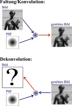 Ein einfaches Beispiel ist etwa das Schärfen eines Bildes. Der Vorgang des Verwischens (Unschärfe) wird durch eine Faltung dargestellt. Das Schärfen des Bildes, wie es viele Bildbearbeitungsprogramme unterstützen, entspricht dann einer Dekonvolution (siehe Bild rechts).