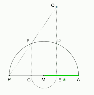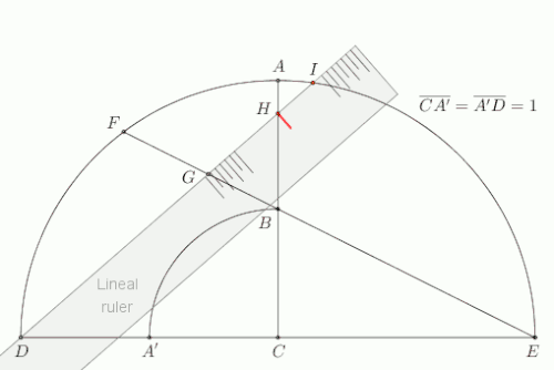 Weiter geht es mit dem Ziehen des Viertelkreises um mit Radius , bis er die Strecke in schneidet, sowie des weiteren Viertelkreises um mit Radius , bis er die Strecke in schneidet. Es folgt die Halbierung der Strecke in . Schließlich liefert der Halbkreis um über , mit Schnittpunkt auf dem Radius , die theoretisch exakte Kantenlänge des verdoppelten Würfels.