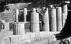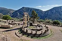 Östlich des dritten Tempels stand die Tholos, ein von dem Architekten Theodoros von Phokaia um 380 v. Chr. entworfener Rundbau, zu dem Theodoros auch ein bei Vitruv genanntes theoretisches Werk schrieb.[43] Der für seine Zeit außergewöhnliche Rundbau, ganz aus pentelischem Marmor ausgeführt, lediglich der Cellaboden und der Sockel unter der inneren Säulenstellung waren aus dunklem, eleusinischen Kalkstein, hatte im Stylobat einen Durchmesser von 13,50 Meter. Der Durchmesser des zylindrischen Baukörpers der Cella betrug 8,60 Meter. Zwanzig Säulen dorischer Ordnung mit je 20 Kanneluren bildeten dessen Peristase. Ihnen antworteten im Inneren neun Säulen korinthischer Ordnung, eine zehnte Säulenstellung fiel wegen der Türöffnung weg. In dem radialsymmetrisch angelegten Entwurf korrespondierten somit die korinthischen Säulen mit jedem zweiten Interkolumnium der Peristase. Deren knapp 6 Meter hohe Säulen trugen einen Triglyphen-Metopen-Fries, von dessen einst 40 Metopen nur wenige Reste mit Darstellungen von Kentauren und Amazonen erhalten sind. Auch die Cellawand wurde von einem umlaufenden Triglyphon mit 40 Metopen bekrönt. Als Besonderheit wies die Tholos eine doppelte Sima als Abschluss des Gebälkes auf. Der Bau eröffnete eine kleine Gruppe besonders kostbarer Heiligtumsbauten, alle auf dem Prinzip des Rundbaus beruhend und im 4. Jahrhundert v. Chr. errichtet, die mit der Tholos von Epidauros und dem Philippeion in Olympia zwei weitere, außergewöhnliche Vertreter fand. Die Funktion der Tholos in Delphi ist ungeklärt.[44] Drei der einst 20 dorischen Säulen wurden 1938 wieder aufgestellt.[45]