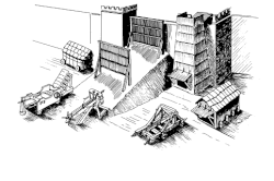 Bei Einbruch des Winters setzte Demetrios die Belagerung vom Land aus fort. Wie schon bei Salamis ließ er von mehr als 25.000 Handwerkern eine neue Helepolis bauen, die ihre Vorgängerin an Größe noch übertraf. Sie erhob sich auf einer vierseitigen Basis von je 50 Ellen, auf annähernd 100 Ellen in die Höhe. Von drei Seiten wurde sie durch eine Blechverkleidung vor Brandpfeilen geschützt und besaß an ihrer Front mehrere Öffnungen für Geschütze aller Art. Bedient wurde sie von etwa 3.400 Soldaten.[19] Dazu ließ er zwei Sturmböcke von 125 Metern Länge bauen, die von je 1.000 Mann bedient wurden. Währenddessen verbesserten die Rhodier ihre Lage, indem sie mit ihrer Flotte mehrere Ausfälle aus ihrem Hafen wagten und Demetrios’ Nachschub zur See störten. Hilfe erhielten sie dabei von der ptolemäischen Flotte, der es gelang eine große Getreidelieferung in den Hafen zu steuern. Auch von Lysimachos und Kassander erhielten die Verteidiger Nachschub an Nahrung und Waffen.