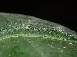 Laubblätter an unterschiedlich alten, auch am gleichen, Pflanzenexemplaren können sehr unterschiedlich geformt sein.[1] Die Jugendblätter sind deutlich größer als die später erscheinenden.[2] Die wechselständig an den Zweigen angeordneten Laubblätter sind in Blattstiel und -spreite gegliedert. Der Blattstiel ist meist 5 bis 10, selten bis zu 15 Zentimeter lang[1] und flaumig bis zottig behaart.[2] Die Laubblätter sind stets, besonders die größeren sehr jungen, mit Brennhaaren besetzt. Die einfache, pergamentartige Blattspreite ist fiedernervig mit sechs bis acht Blattnerven auf jeder Seite des Hauptnerv und das basale Nervenpaar ist erhaben.[2] Die Blattspreiten sind bei meist einer Länge von 10 bis 25 Zentimetern sowie einer Breite von 5 bis, meist 10 bis 20 Zentimetern breit-eiförmig bis fast kreisförmig mit tief-herzförmiger Spreitenbasis mit zwei sich überlappenden Blattlappen und stumpf zugespitztem oberen Ende.[1][2] Der Blattrand kann glatt bis bei exponierten Laubblättern regelmäßig gezähnt sein.[1] Die Blattoberseite ist flaumig und die -unterseite zottig behaart.[2] Laubblätter weisen oft Insektenfraß auf.[2] Die Nebenblätter sind 1 bis 2 Zentimeter lang.[2]