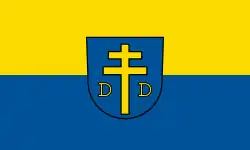 Blasonierung: „In Blau ein goldenes (gelbes) Patriarchen-Hochkreuz zwischen den beiden goldenen (gelben) Großbuchstaben D.“[7][8] |