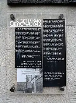 „Auf Anordnung der deutschen Besatzungsbehörden wurde das Ghetto am 16. November 1940 von der Stadt getrennt. Das von einer Mauer umgebene Gebiet war zunächst 307 ha groß, dann wurde es verkleinert. Ab Januar 1942 war das jüdische Viertel in zwei Teile, in das sogenannte große und kleine Ghetto, geteilt. Ungefähr 360.000 Juden aus Warschau und 90.000 weitere aus anderen Ortschaften waren im Ghetto eingeschlossen. Circa 100.000 Menschen verhungerten. Im Sommer 1942 deportierten und ermordeten die Deutschen fast 300.000 Menschen in den Gaskammern von Treblinka. Am 19. April 1943 ist der Ghettoaufstand ausgebrochen. Bis Mitte Mai kamen Kämpfer und Zivilisten im Kampf und in den Flammen des systematisch in Brand gesteckten Ghettos ums Leben. Diejenigen, die bisher noch lebten, wurden von den Deutschen im November 1943 in den Konzentrationslagern Majdanek, Poniatowa und Trawniki ermordet. Nur wenige haben überlebt.