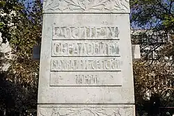 Die Skulptur wurde auf ein hohes rechteckiges Postament gesetzt, auf dessen Vorderseite folgende Widmung eingemeißelt wurde: „Für Dositej Obradović, das dankbare serbische Volk“ und auf der Rückseite das Motto des Autors, das dem Brief an Haralampi[8] entnommen wurde: „Ich werde für den Geist, das Herz und das Wesen des Menschen schreiben und für die Brüder Serbiens, welchem Gesetz und Glauben sie auch immer folgen.“ Dositej wurde in Bewegung, mit Hut, Büchern und einem Stock in der Hand, dargestellt. Auf dem unteren Teil seines Postamentes stehen seine Worte: „Im Gehen lernt er, in die Jahrhunderte schaut er!“