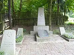 - Im Jahr 1955 weihte die Stadt Aue in einer kleinen Grünanlage zwischen Gellertstraße und dem Floßgraben' einen Betonobelisken mit einer Bronzetafel als Ehrenmal für gefallene sowjetische Soldaten ein.[8]