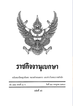 - Abschnitt 7 räumt der Generaldirektion die Vollmacht ein, jedes ihr geeignet erscheinende Monument durch Veröffentlichung im amtlichen Regierungsanzeiger (Royal Thai Government Gazette) zum geschützten Denkmal zu erklären und die Größe des notwendigen Geländes um das Denkmal herum festzulegen. Dieses Gelände soll wie das Denkmal selbst geschützt sein. Änderungen auf oder Streichungen von der Denkmalliste müssen ebenfalls im Regierungsanzeiger publiziert werden. Sollte sich das Monument oder das Grundstück in Eigentum oder Besitz einer anderen Person[19] befinden, muss diese von der Generaldirektion informiert werden. Der Eigentümer oder der Besitzer hat danach 30 Tage Zeit, einen Gerichtsentscheid gegen die Registrierung oder die Bemessung der Grundstücksgröße zu beantragen. Wenn er dies versäumt oder das Gericht die Klage letztinstanzlich abweist, kann die Generaldirektion mit dem Eintragungsprocedere fortfahren.