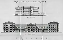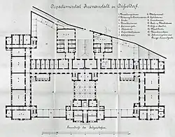 - ↑ Theobald Géronne: Uebersicht der von der Königlichen Regierung zu Düsseldorf über das Medizinal- u. öffentliche Sanitätswesen erlassenen Verordnungen, L. Schwann, 1890. In Krankenanstalten. Im Allgemeinen. 1) Baupläne (Reg.-Verf. vom 21. Jan. 1861), S. 332 (uni-duesseldorf.de)