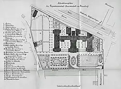 Zwischen den verschiedenen Gebäuden befanden sich Höfe und Hallen für den Aufenthalt der Kranken im Freien, östlich und nördlich vor dem Frauenhaus die Bleichen, auf dem südlichen Teile des Anstaltsterrains ein Garten für den Verwalter und der große Gemüsegarten der Anstalt, dessen westliche Ecke den Stroh- und Trockenschuppen sowie die Sammelgrube enthielt. Die Abortanlagen waren nach dem „Heidelberger Tonnensystem“ eingerichtet und mit Ventilationsöffnungen versehen.[23] Täglich wurden die luftdicht verschlossenen Tonnen auf einem Schienengleis zu der Sammelgrube gefahren und in dieselbe entleert. Der Inhalt dieser Grube wurde dann durch die städtische Dampf-Latrinen-Reinigungs-Anstalt abgefahren.