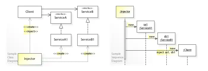 Im UML-Klassendiagramm instanziiert die Client-Klasse, für die die Objekte ServiceA und ServiceB erforderlich sind, die Klassen ServiceA1 und ServiceB1 nicht direkt. Stattdessen erstellt eine Injector-Klasse die Objekte und injiziert sie in den Client, wodurch der Client unabhängig davon wird, wie die Objekte erstellt werden.