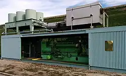 Durch die bis Ende 2008 erfolgte unbehandelte Deponierung von Hausmüll mit hohen biologischen Abfallanteilen kommt es in dem aufgeschichteten Müll zur Bildung von Deponiegas, welches primär aus Methan und Kohlenstoffdioxid besteht. Um die unkontrollierte Gasentweichung von Methan und mögliche Gasansammlungen in Hohlräumen wie in Kellern von benachbarten Gebäuden, verbunden mit einer Explosionsgefahr, zu vermeiden, wurden 1991 die ersten 70 Gasbohrungen mit den zugehörigen Sammelleitungen, einer Deponiegasverdichteranlage, einer aus Sicherheitsgründen nötigen Gasfackel zum sicheren Abfackeln von überschüssigen Deponiegas, sowie einem Deponiegasmotor installiert. In den Jahren 1994 kamen 30 und 1995 abermals 64 Gasbrunnen hinzu. Die Zahl der Gasfackeln wurde 1993 auf drei erhöht. Im Jahr 2001 bestanden bereits 200 Gasbrunnen auf dem Deponiegelände.[5] Im November 1994 wurde eine neue Deponiegasverwertungsanlage, neun Gasmotor-Module mit einer installierten Leistung von knapp 6 MW in Betrieb genommen. Die elektrische Anlage steht neben der Deponie und wird von einer Privatfirma betrieben und die gewonnene elektrische Energie (2009: ca. 7,1 GWh) wird in das E-Netz der Wiener Stadtwerke eingespeist. Die im Jahr 2015 erzielbare mittlere Leistung von knapp einem 1 MW nimmt durch die Erschöpfung der Gasvorräte in der Deponie kontinuierlich ab.