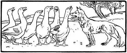 Der Fuchs will eine Herde Gänse auffressen und hört auf keine Bitte als die, dass sie noch ein Gebet sprechen dürfen. Danach wollen sie sich dann für ihn in eine Reihe stellen. Eine nach der anderen beginnt zu gackern ga! ga!, und sie hören nicht mehr auf.