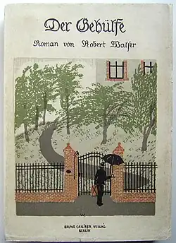 - Robert Walser: Der Gehülfe. Roman, Verlag von Bruno Cassirer, Berlin 1908. 2 Bl., 392 S., 6 Bl. Anzeigen. Originalbroschur mit farbiger Deckelillustration von Karl Walser.