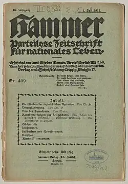 Der Hammer – Blätter für deutschen Sinn war eine deutsche Zeitschrift mit völkischer, antisemitischer Propaganda. Sie war das bedeutendste und am meisten verbreitete Blatt der völkischen Bewegung im deutschen Kaiserreich. Sie erschien zunächst halbmonatlich und später monatlich, mit Unterbrechungen, von 1902 bis 1940. Der anfängliche Titel lautete Hammer. Parteilose Zeitschrift für nationales Leben. Verleger war Theodor Fritsch mit dem 1902 gegründeten Hammer-Verlag mit Sitz in der damaligen Königstraße (heute Goldschmidtstraße) im Graphischen Viertel von Leipzig.[1] Die erste Auflage erschien im Januar 1902 mit einer Auflage von 10.000 Stück.[2] Ab 1912 war das Blatt auch Organ des von Fritsch gegründeten Reichshammerbundes, der aus den sogenannten Hammer-Leserkreisen hervorging.[3] In der Weimarer Republik wurde der Hammer mehrmals verboten,[4][5] die Auflage ging in dieser Zeit rasant zurück, Anfang 1933 betrug sie nur noch 2.500 Exemplare. Mit dem Tod von Fritsch im gleichen Jahr verlor die Zeitschrift endgültig an Bedeutung. Fritschs unmittelbarer Nachfolger als Schriftleiter des Blattes war Kurt Herwarth Ball.[6]