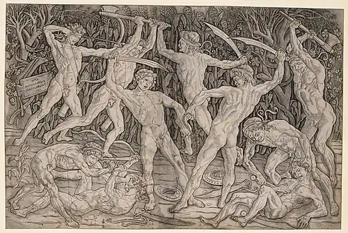 In der jüngeren Diskussion wurde darüber diskutiert, ob Pollaiuolo ein römisches Relief thematisierte. Die Kunsthistorikerin Fern Rush Shapley vermutete jedoch, dass viele Werke Pollaiuolos, darunter auch Der Kampf der nackten Männer, von den griechischen Vasen inspiriert seien, insbesondere von den Vasen des Niobiden-Malers.[24] Auf griechischen Vasen sind ähnliche Gesten und Kompositionen zu sehen, wie z. B. im Blatt Der Kampf der nackten Männer. Die Waffen und Rüstungen, die Pollaiuolo darstellte, finden sich auch in den Werken des Niobiden-Malers.[24] Der Kunsthistoriker Erwin Panofsky meinte, dass es sich um die Geschichte von Titus Manlius Imperiosus Torquatus handle. Titus Manlius Torquatus gewann eine Kette in einem Kampf und erhielt dadurch den Beinamen Torquatus.[15][25][17][26] Es gibt auch andere Interpretationen des Werks. Einige sehen es entweder als Darstellung der Geschichte von Iason aus der griechischen Sage oder als Darstellung einer mittelalterlichen Schlacht.[25][27][26] Andere vermuten, dass es sich um die Geschichte von Kadmos handelt, der in der griechischen Mythologie als Sohn des phönizischen Königs Agenor von Tyros bekannt ist.[28] In der Sage kämpften die bewaffneten Männer gegeneinander und es ist unklar, ob die Figuren am Ende des Kampfes entkommen sind. Eine Terrakotta im Victoria and Albert Museum wurde nach diesem Kupferstich von Pollaiuolo geschaffen und zeigt aber sechs Figurenpaare.[28]