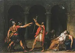 Der Schwur, den David darstellt, kommt bei Livius allerdings nicht vor, auch nicht bei einem der anderen Autoren (z. B. Plutarch, Valerius Maximus und Dionysios von Halikarnassos). Selbst in dem Theaterstück „Horace“ des Dramatikers Pierre Corneille wird er nicht gezeigt. Dieses 1640 in Paris uraufgeführte Stück, das als eigentliche Themen den Patriotismus und die Macht des Volkes zum Inhalt hatte, war der Pariser Gesellschaft zur Zeit Davids gut bekannt und der Künstler selbst war von dieser Aufführung begeistert. Damit hatte David sein Motiv für den staatlichen Auftrag gefunden und begab sich eigens mit seiner Familie nach Rom, um sich ganz in die Formenwelt der Antike einzusehen.[1]
