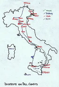 Den Helden der Erzählung, die auf einer wahren Begebenheit[2][3] beruht, nennt Delius Paul Gompitz. Gompitz hat als Schullektüre Johann Gottfried Seumes Spaziergang nach Syrakus im Jahre 1802 gelesen und den Plan gefasst, einmal in seinem Leben auch nach Italien zu reisen.