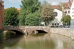 Derrerbrücke, heutige Untere Karlsbrücke in Nürnberg. Von 1486 bis 1522 im Besitz der Familie. Die Karlsbrücke befindet sich in unmittelbarer Nähe zum damaligen Stammhaus der Derrer am Maxplatz 18.