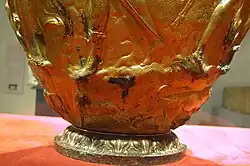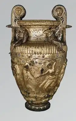 Die Mündungslippe des Kraters ist mit einem geprägten ionischen Kyma geschmückt. Auf den Ringdarunter ist ein lesbisches Kyma graviert und mit versilberten Kupferelementen eingelegt; es ist besetzt mit einzeln gefertigten und aufgelöteten bronzenen Blumen und Palmetten. An den Stellen, an denen sie fehlen, sieht man zart eingravierte Symbole und Buchstaben, sie werden gedeutet als Merkzeichen für den Toreuten. Ebenfalls mit einem lesbischen Kyma geschmückt ist der Fuß des Kraters. Auf der oberen, schmaleren, Zone des Halses sind zwölf separat gefertigte, in Bronze getriebene Tierfiguren appliziert. Dem Uhrzeigersinn folgend umlaufend aufgereiht sind: ein Löwe, im Maul ein erlegtes Reh tragend, ein Eber, ein Panther, zwei Greife, ein Hirsch, ein weiterer Panther, ein weiterer Hirsch, auf den Vorderläufen kniend, dann ein dritter Panther, die Pranke erhebend, ein Widder, ein Hirschkalb und eine Löwin. Die untere, breitere Zone des Halses ist belegt mit zwei aufgelöteten silbernen Efeuranken, die auf Vorder- und Rückseite des Kraters verknotet sind und in Beeren enden. Die Schulter des Kraters ist mit getriebenen Zungen geschmückt.