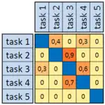 - Numerische DSM: Eine Gewichtung der Beziehung ist möglich; meist werden Werte zwischen 0 und 100 % verwendet, aber auch andere Gewichtungen sind denkbar.