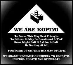 Das Symbol der Missionarischen Kirche des Kopimismus ist eine Pyramide mit einem dreidimensionalen K oder C in der Spitze, je nach Sprache. Es wurde vom Piratbyrån als Gegenteil von Copyright entworfen, d. h., es zeigt an, wenn ein Werk kopiert werden soll.[12]