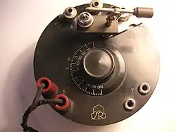 Historischer Detektorempfänger der Firma Heliogen (Deutschland 1935). Aufgesteckt sind: (links oben) eine Schwingkreisspule und ein Kristall-Detektor sowie links unten ein Sperrkreis.