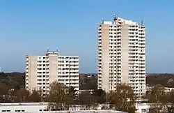 Die neue Wohnsiedlung war asymmetrisch konzipiert und in drei Nachbarschaften mit jeweils 5000 Einwohnern unterteilt. Die Nachbarschaften wurden durch unterschiedliche Gebäudetypen (Punkt- und Kettenhochhäuser, ein Stufenhochhaus, Zeilenbauten und Einfamilienhäuser) gebildet, deren Höhenentwicklung nach Auffassung der Planer (und niederländischen Vorbildern) ein mögliches Auseinanderfließen der Siedluntg in die Landschaft vermeiden sollte.[6] Einzelne Gebäude entwarfen international renommierte Architekten, wie etwa Alvar Aalto (Stephanuskirche), Dieter Oesterlen (Schwedenhochhaus) oder Hans Scharoun (Stephanus-Kindergarten). Die Einfamilienhäuser gehen auf einen Architektenwettbewerb von 1962/63 mit 13 regionalen Architekturbüros zurück. Diese Bauten prägen das Stadtbild durch rote Backsteinfassaden, ein- bis eineinhalbgeschossige Flachdachbauten mit breiter weißer Attika.[6]