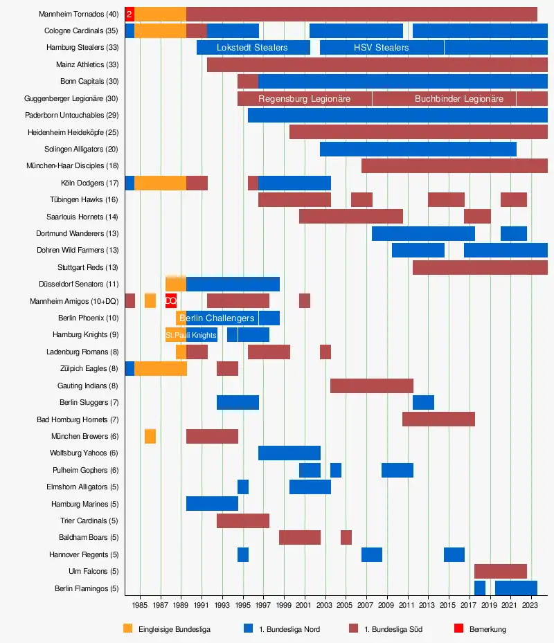 Die Cologne Cardinals sind das einzige Gründungsmitglied, was 2025 nach zwei zwischenzeitlichen Abstiegen in der Bundesliga vertreten ist, 2023 stiegen die Mannheim Tornados als letztes Gründungs-Team, erstmals ab.