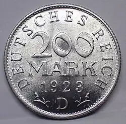 Im Oktober 1921 wies die Mark noch ein Hundertstel ihres Wertes vom August 1914 auf, im Oktober 1922 nur mehr ein Tausendstel. Die Inflation beschleunigte sich so sehr, dass die Münzprägung nicht mithielt. Die einzigen Münzen, die auf den Beginn der Inflation verweisen, sind die im Jahr 1923 geprägten 200- und 500 Markmünzen aus Aluminium. Sie hatten aber mittlerweile einen so geringen Nominalwert, dass sie im Geldumlauf ohne Bedeutung waren.