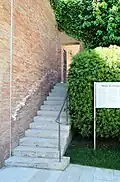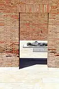 Der Eingang besteht aus einem Vorhof, der mit Travertin gepflastert ist. Hier steht eine Stele mit der Inschrift: