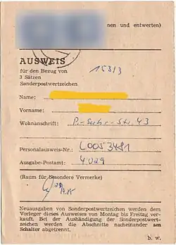 Vom 1. September 1959 an wurden der Verkauf und der Dauerbezug von Postwertzeichen der DDR neu geregelt. Der Verkauf von Sonderpostwertzeichen war nur noch in Mengen bis zu zehn Stück je Wert an einen Käufer zulässig (es gab Ausnahmen). Postwertzeichen konnten von Briefmarkensammlern bei den Postämtern im Ausweisverfahren oder bei der Versandstelle bezogen werden. Mit Wirkung vom 1. Mai 1960 wurden die Sammlerausweise zum Bezug von Postwertzeichen an Mitarbeiter der Deutschen Post gebührenfrei ausgestellt.